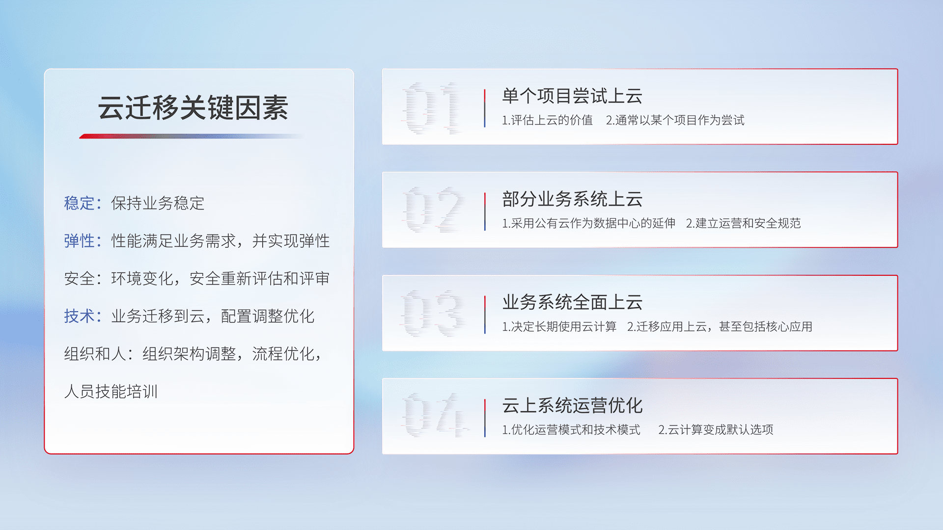 结合实际业务,,,从规划设计、、、云平台选型、、、云原生改造、、、数据迁移、、集成交付,,,,迁移全过程为客户识别最佳上云路径,,,,做好风险识别管理,,设计网络架构、、身份权限、、、安全审计合规、、、操作审计、、、日志审计、、、监控告警策略、、、、多站点容灾设计等,,,,对云上基础设施进行整体规划,,,提升IT治理水平,,以满足弹性、、高可用、、、高性能的需求。。。。
