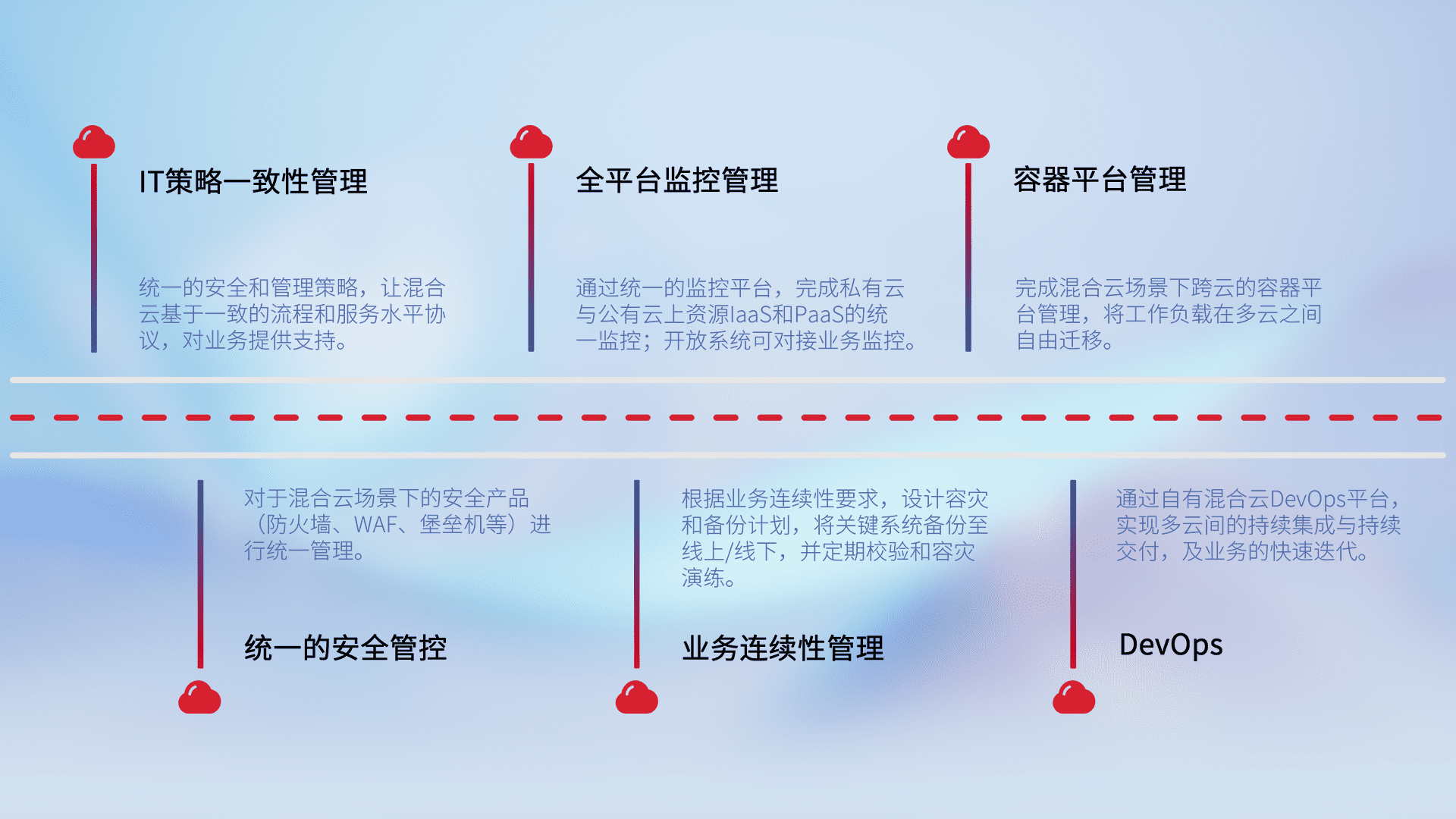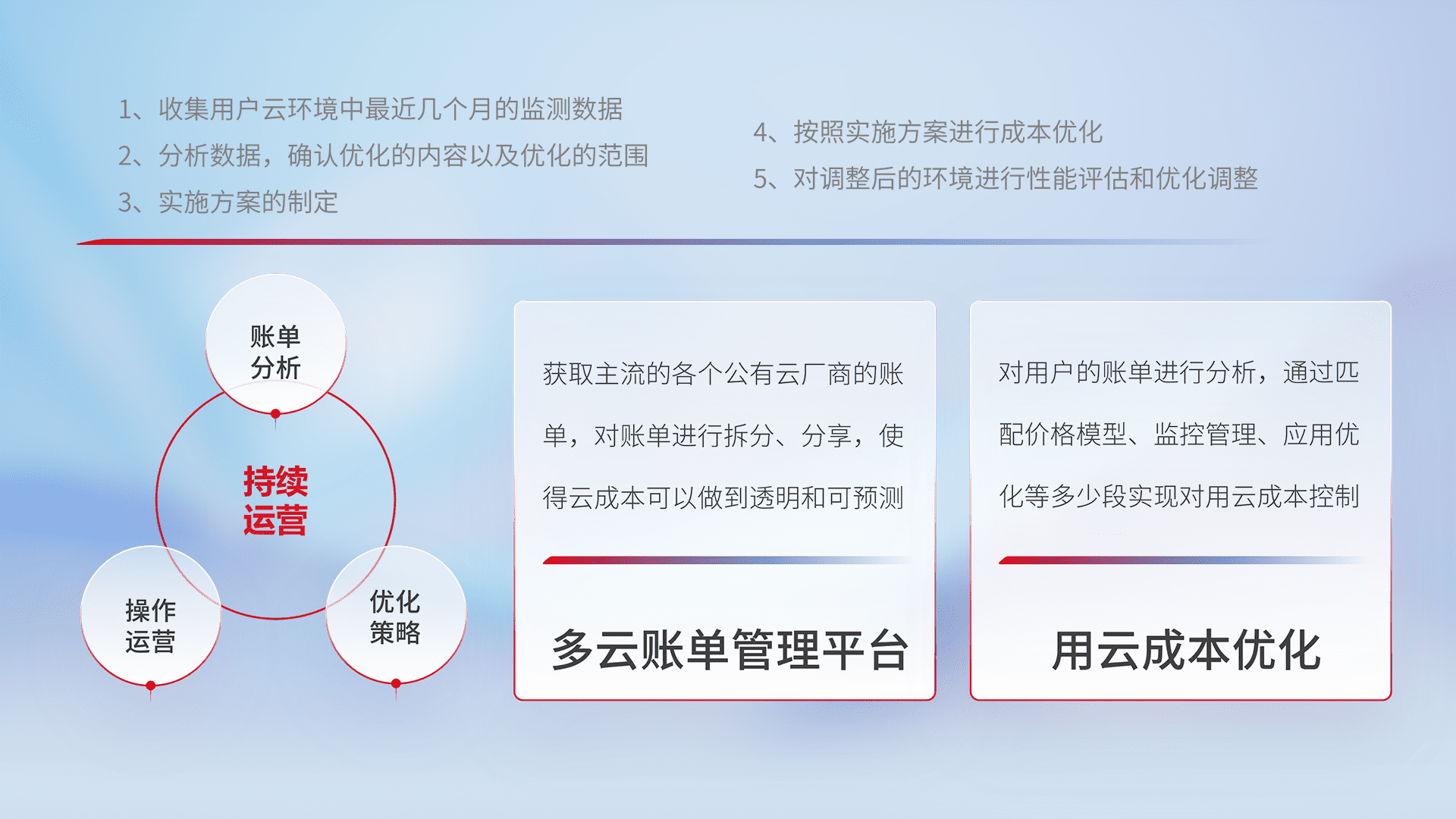 通过多云纳管,,以统一的资源数据模型把客户的云资源进行抽象和封装,,,,进而实现对多云资源的统一操作,,,保障云资源管理的可靠性、、稳定性与可用性。。。量身定制化运维内容,,配置、、、、开发运维、、、、补丁管理、、备份、、、、监控、、认证和访问管理、、审计和日常巡检等,,保障在用云过程中的可靠度,,,稳定度以及高可用率。。