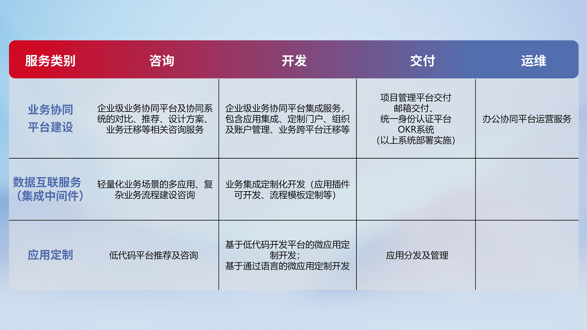 针对钉钉、、、企微、、、IDaas等平台级产品提供产品的规划、、、、方案、、交付、、、、定制化开发等服务,,,,实现如统一协同办公、、、、智能客户服务、、混合会议管理、、、智能数据查询、、等业务场景,,,,实现数字化转型。。